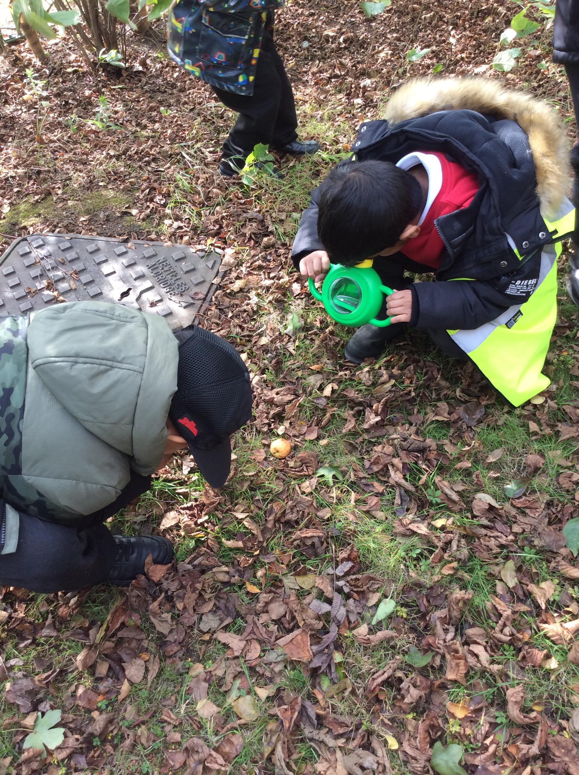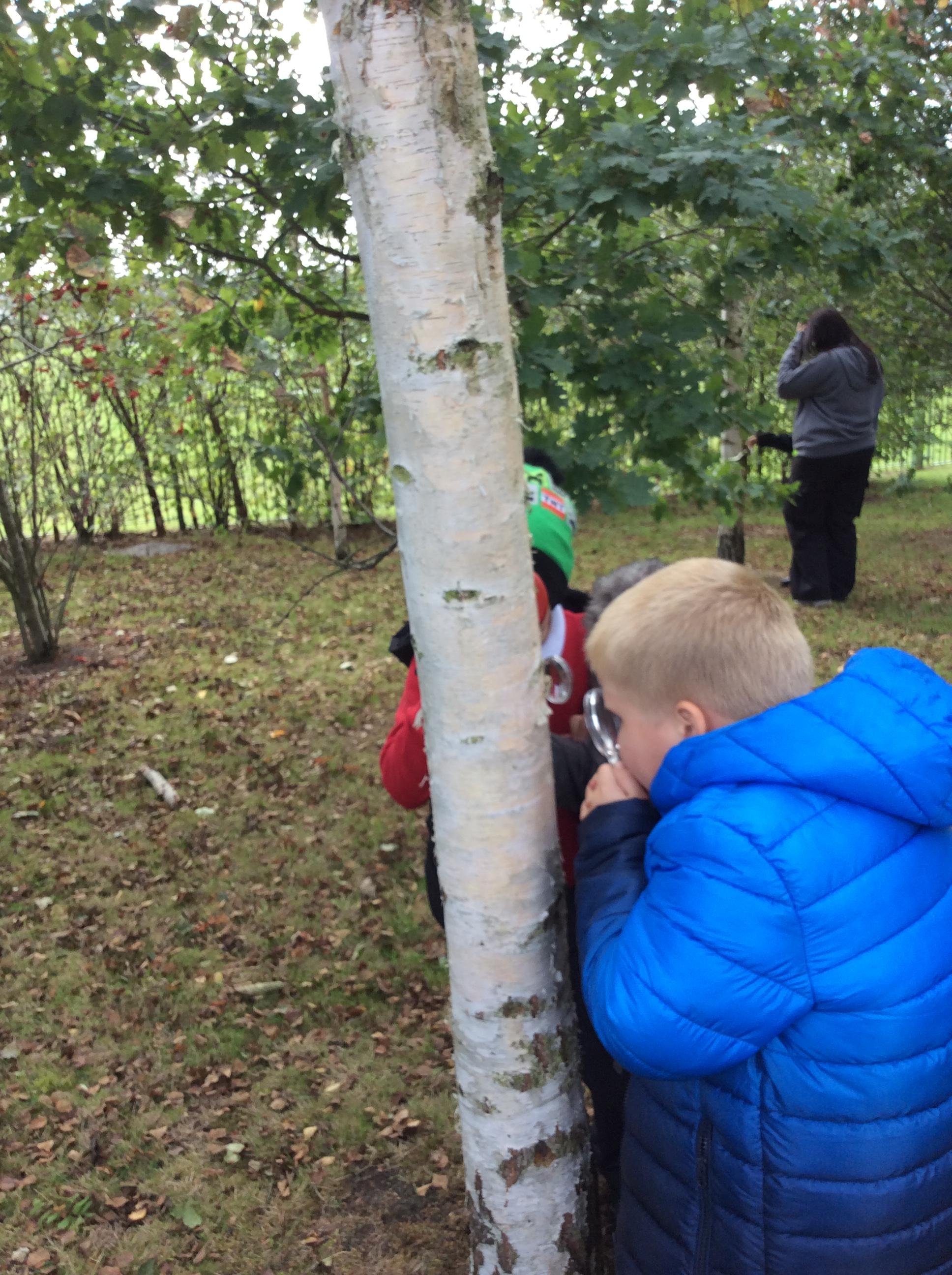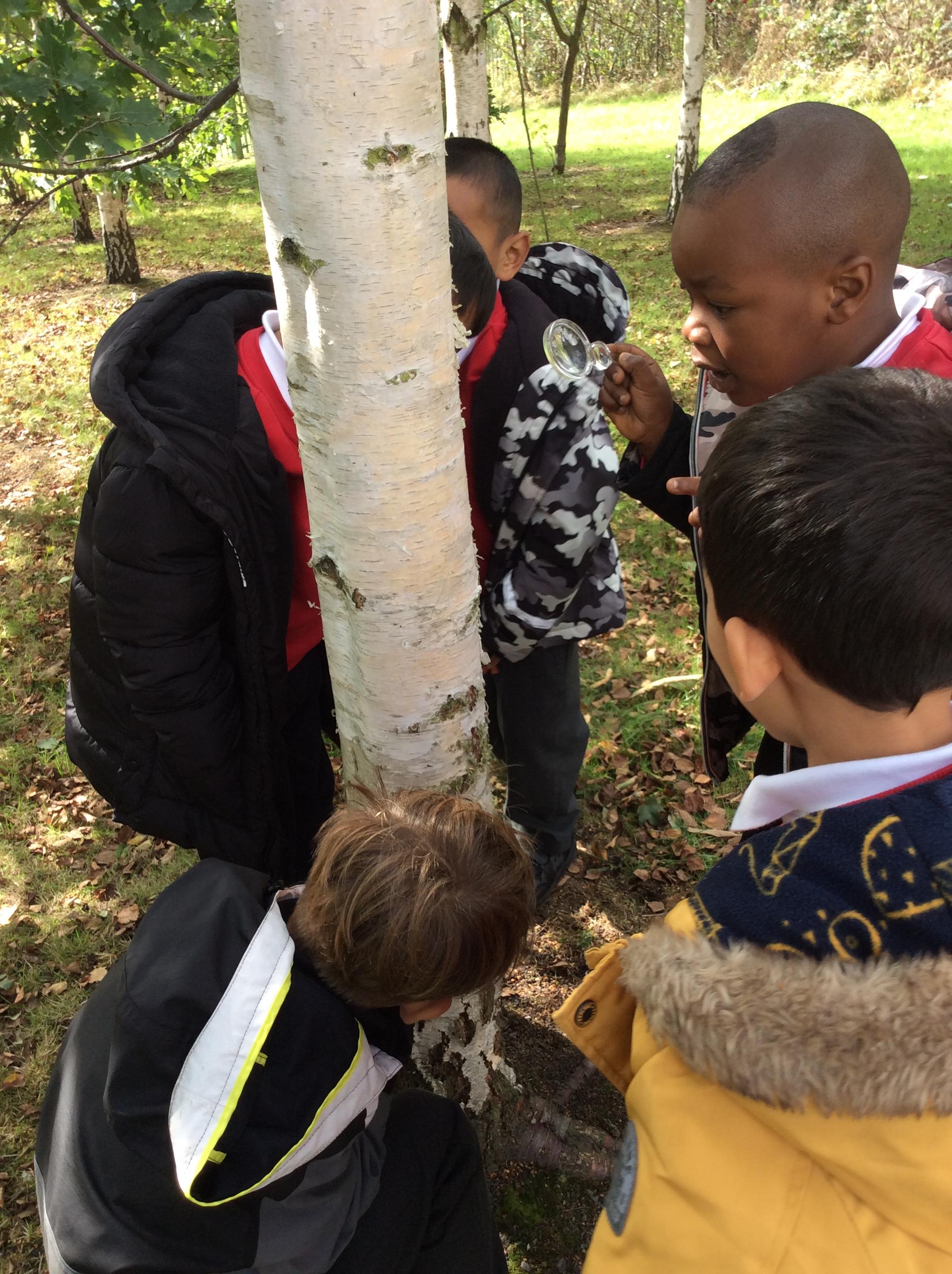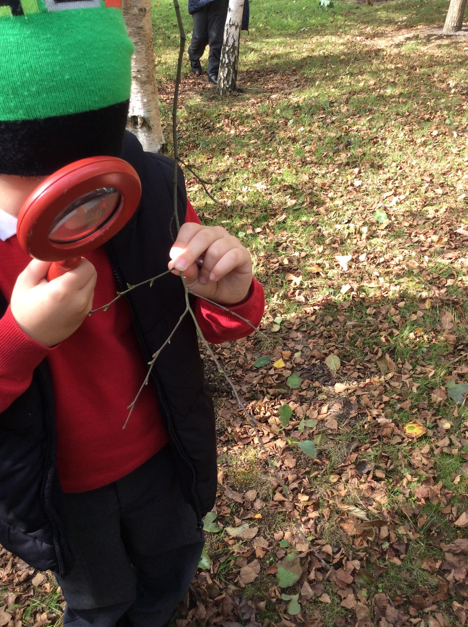 In Science the children were looking in their environment. They looked at the bark on trees, leaves and branches. They also looked for insects they used magnifying glasses to observe carefully.
